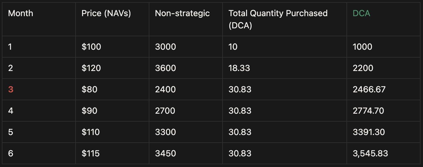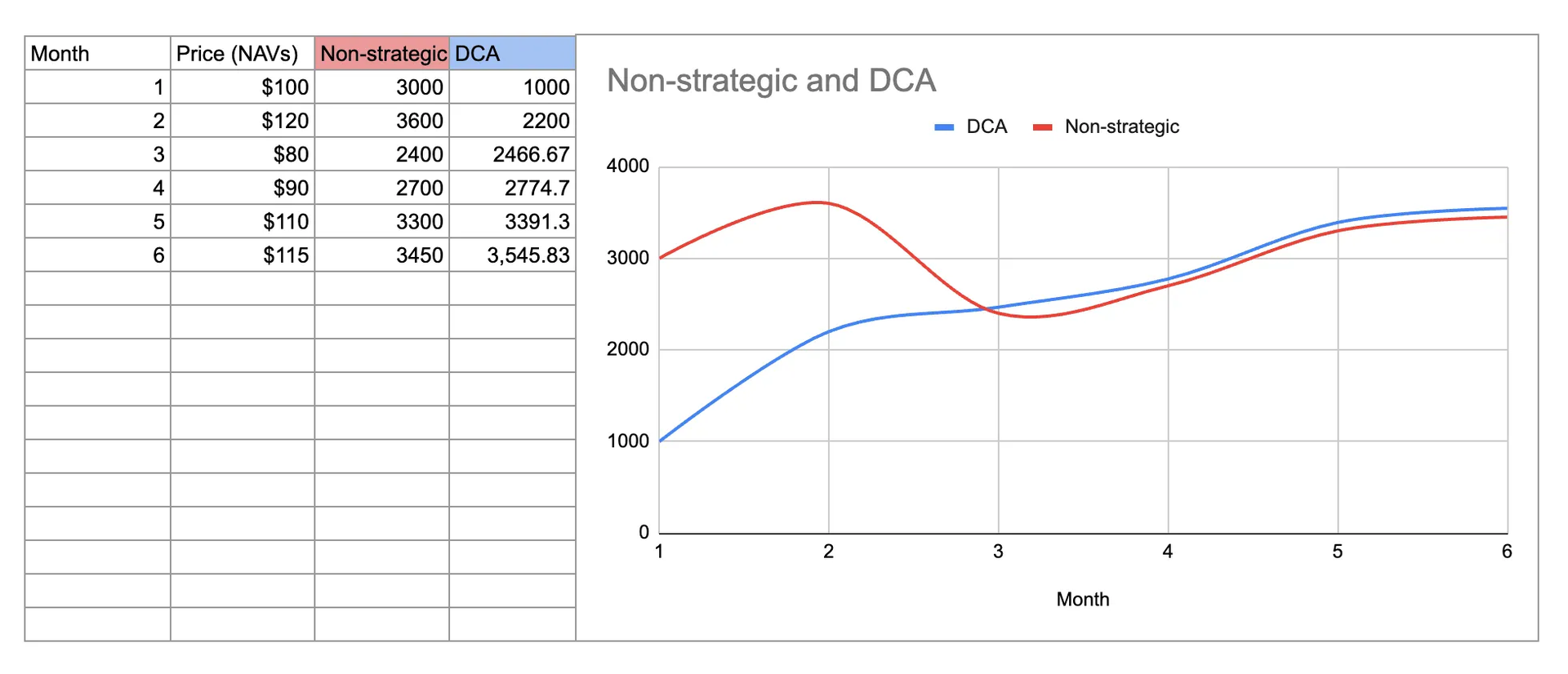 Suppose an investor decides to invest $3,000 over 6 months by buying $1,000 of a specific asset for the first 3 months and applying the DCA strategy. However, if you want to see the powerful impact of cost averaging, check out the difference between cost averaging and not using the strategy (when you invest the entire $3,000 in month 1).