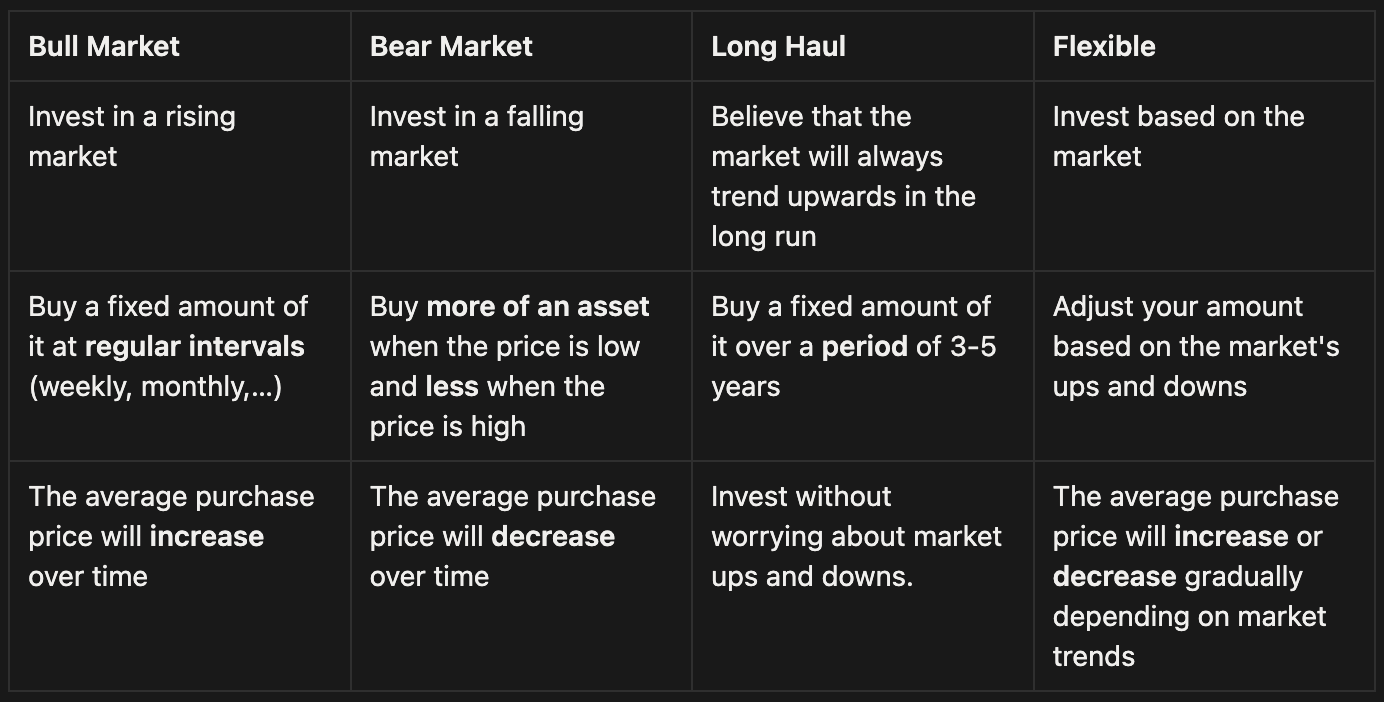 n theory, DCA helps you buy an asset at different prices, thereby minimizing the risk of market fluctuations. However, in practice, traders and investors apply DCA in many different ways, specifically as follows: